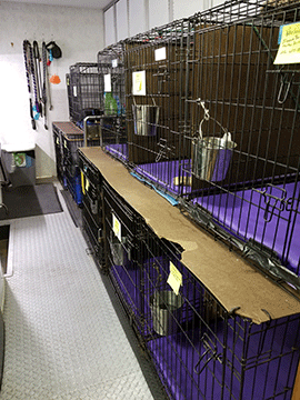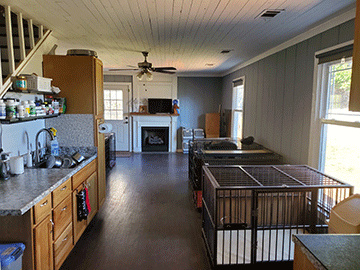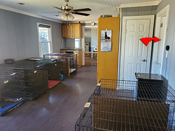 No kennels here, the dogs share my home. Crates have Primo Pads. The red arrow points to my bedroom door. Being so close to the dogs allows me to be alert to their needs, even at night.