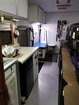 The back 14' of Shelby is the dedicated dog area with its own 15,000 BTU Air Conditioning and exit door. All crates have Primo Pads, fresh water buckets, and identification with the dog's name, owner name and phone number. Internal temperature and power supply is monitored via MarCELL. This area has its own food prep area with large sink, freezer and refrigerator for those dogs who eat raw food.