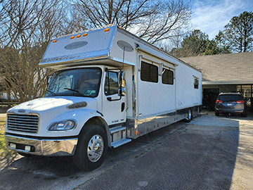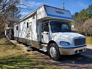 "Shelby" is a 45' Renegade, on a Freightliner chassis with a diesel Caterpillar C7 engine. She is fully contained with 200 gallons of fresh water and a 12,500 watt Onan diesel generator.